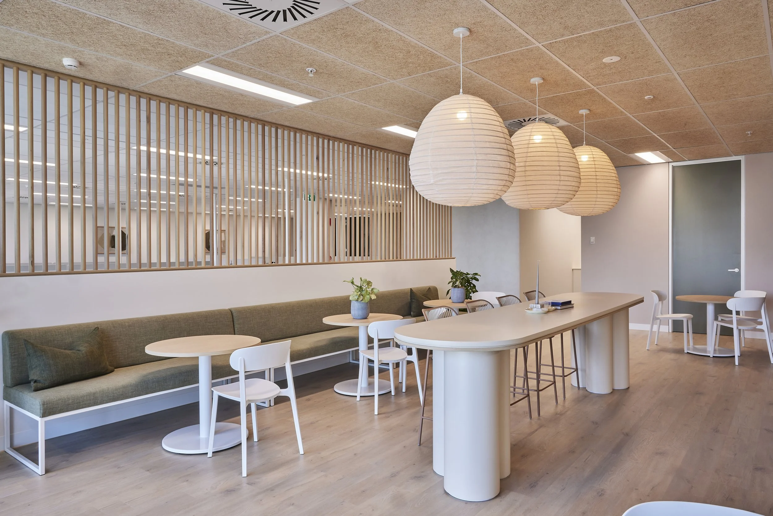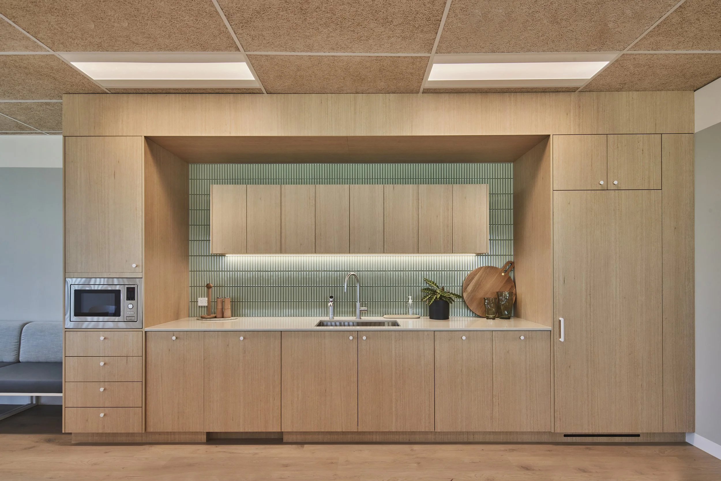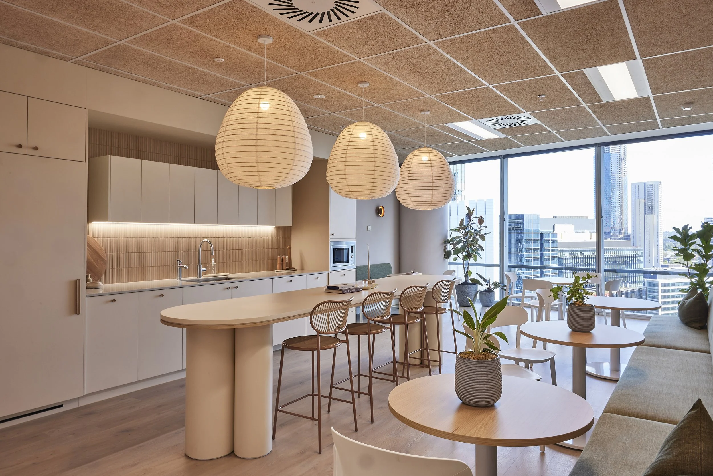At 60 Station Street, Scope Projects collaborated with Hot Black to create light-filled, transparent workspaces shaped by natural materials. Sustainable BAUX acoustic ceiling tiles improve comfort and acoustic performance, while the unique open-plan layout brings a sense of airiness and flow. A warm, inviting breakout space anchors the suite, encouraging connection and offering a relaxed place to gather.