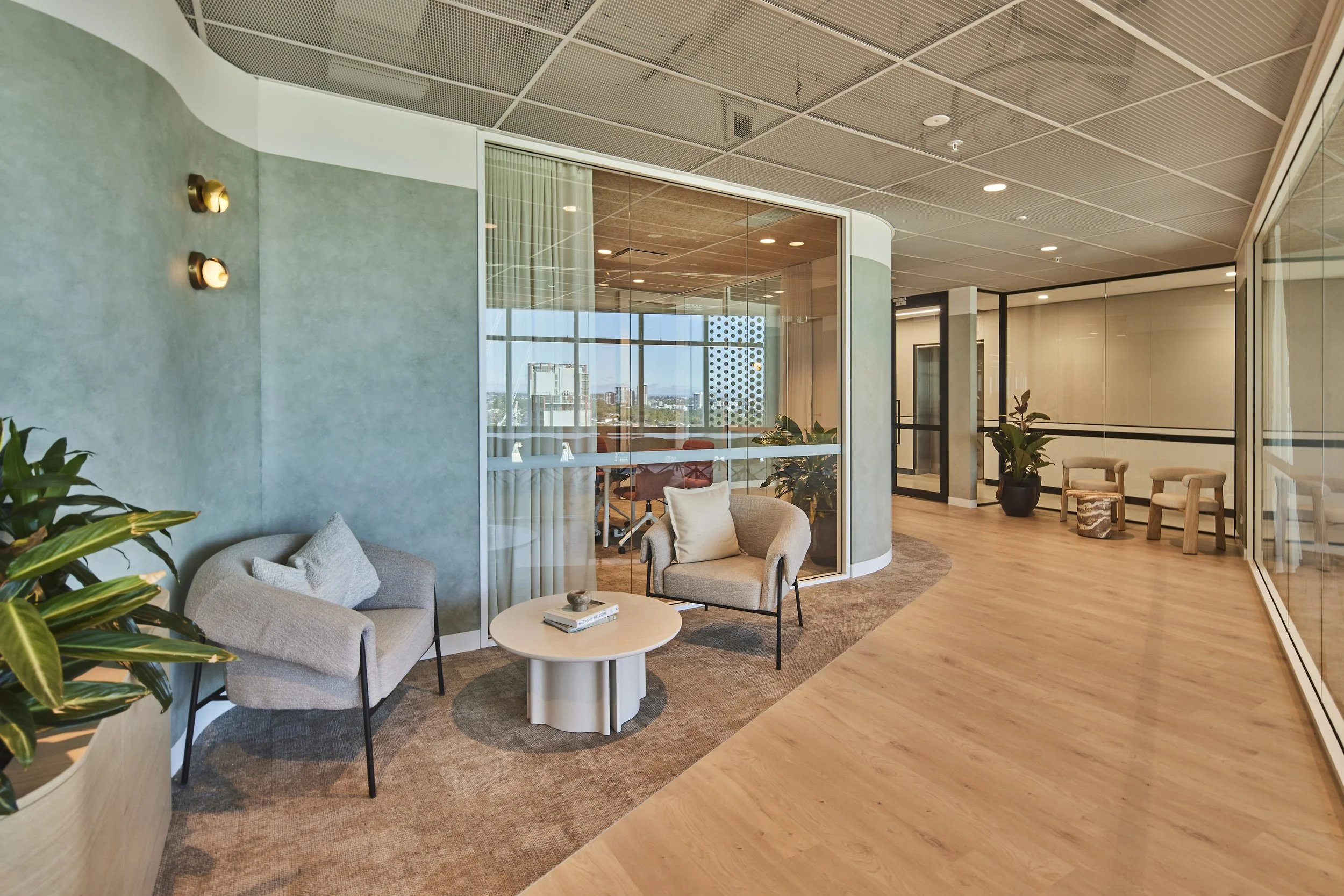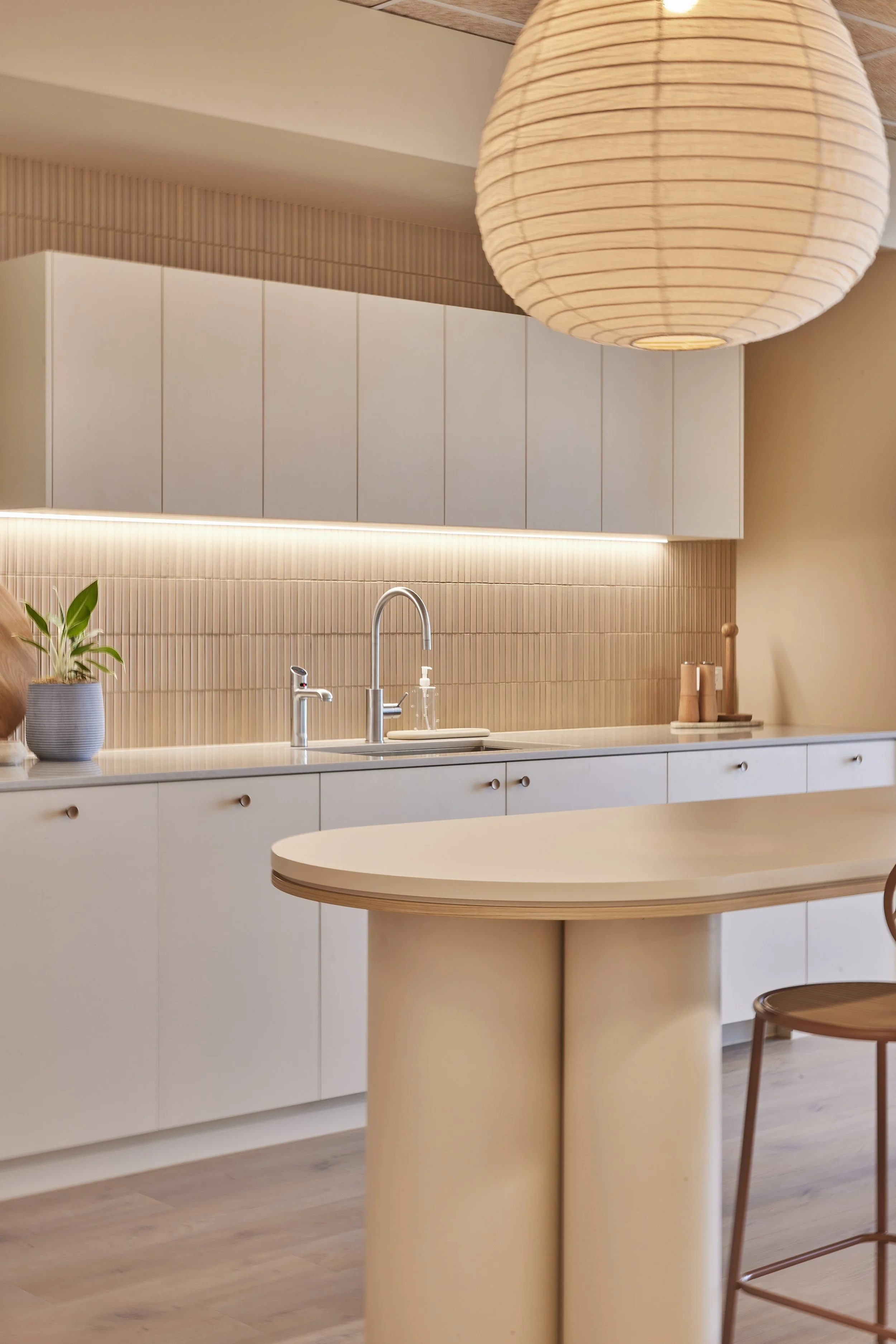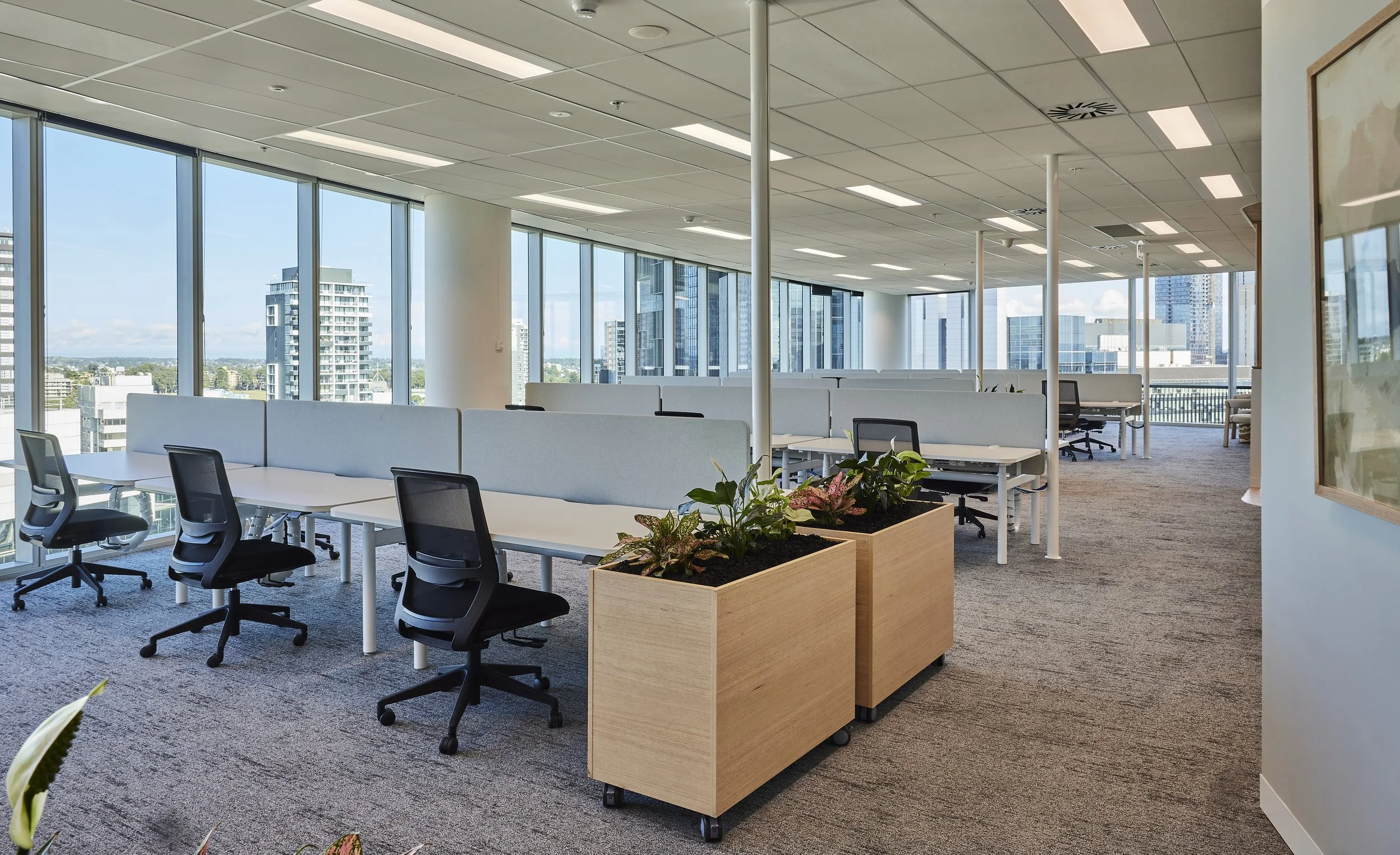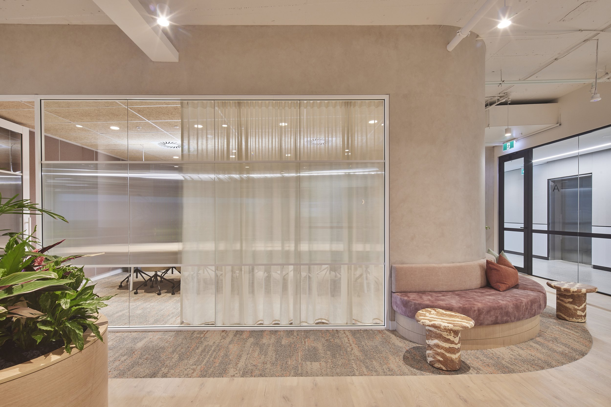 At 60 Station Street, Scope Projects collaborated with Hot Black to create light-filled, transparent workspaces shaped by natural materials. Sustainable BAUX acoustic ceiling tiles improve comfort and acoustic performance, while the unique open-plan layout brings a sense of airiness and flow. A warm, inviting breakout space anchors the suite, encouraging connection and offering a relaxed place to gather.
