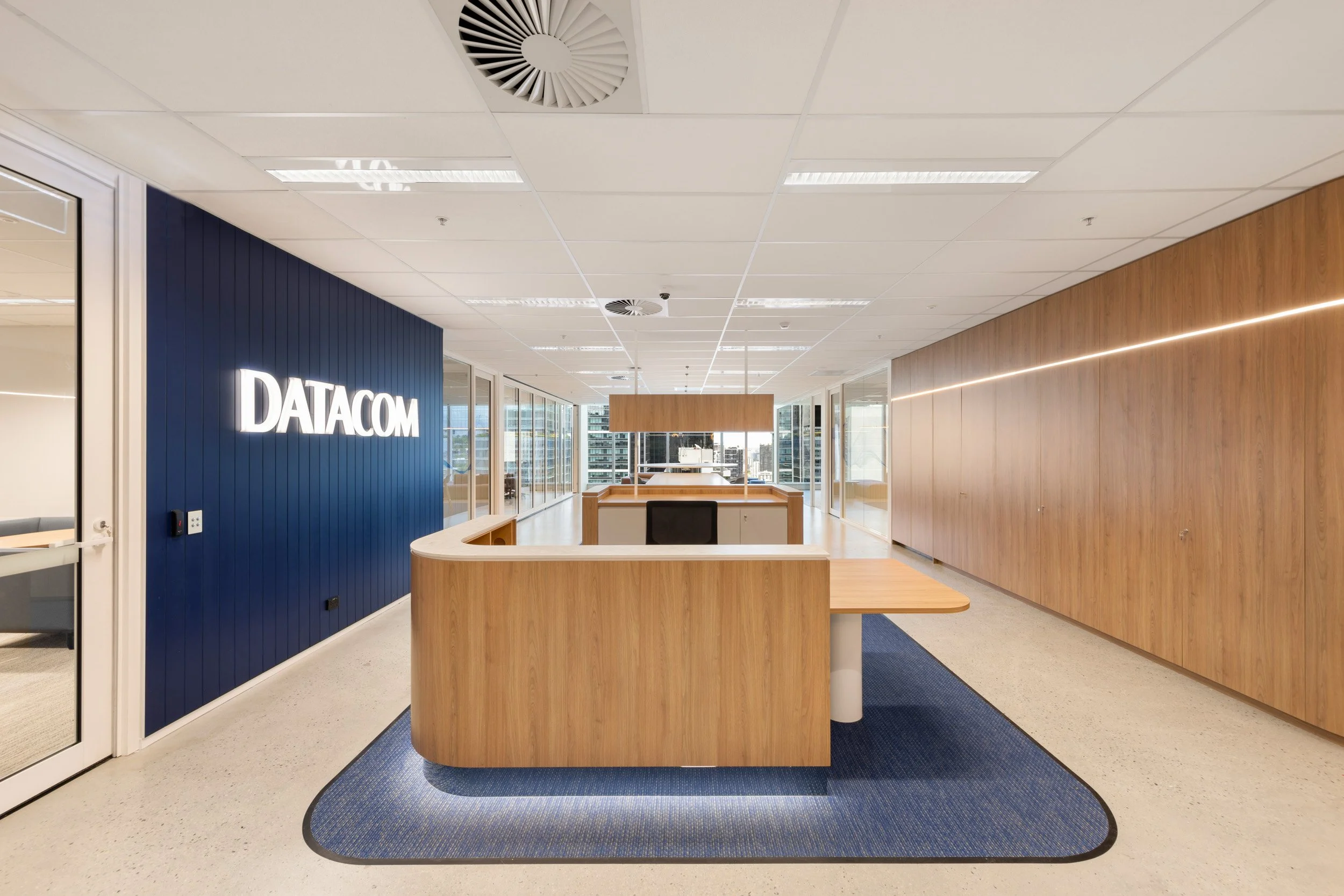 The finishes were carefully curated to reflect Datacom’s brand and ethos, ensuring consistency across its locations nationwide. A warm, natural material palette was infused with strategic pops of colour, creating a balanced and cohesive environment.